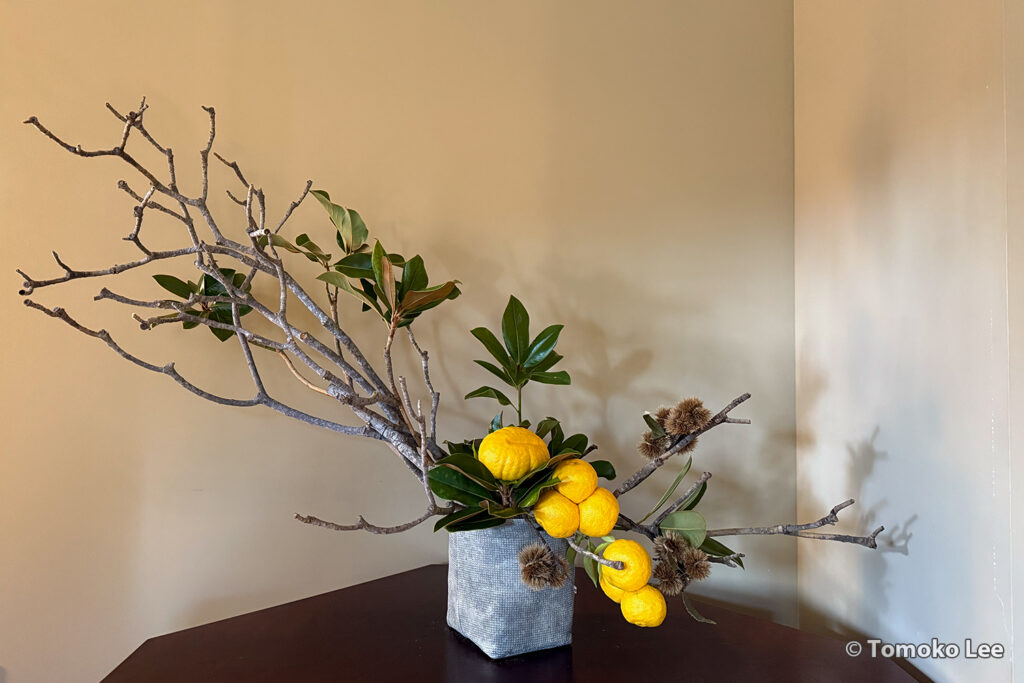 Materials: Yuzu, chestnuts, fresh and dried Magnolia branches